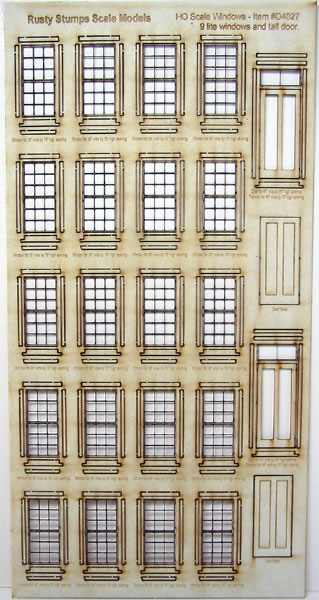 Here is a sheet of laser cut windows & doors with accompanying acetate glazing. The sheet contains a series of windows for 36" wide openings by 76" high. There are double hung with adjustable sashes, single width 44" wide doors with transom plus double width doors. All for the scratch builder or kit basher in you. There is framing pieces including sills and headers. These are ideal for a commercial building.
