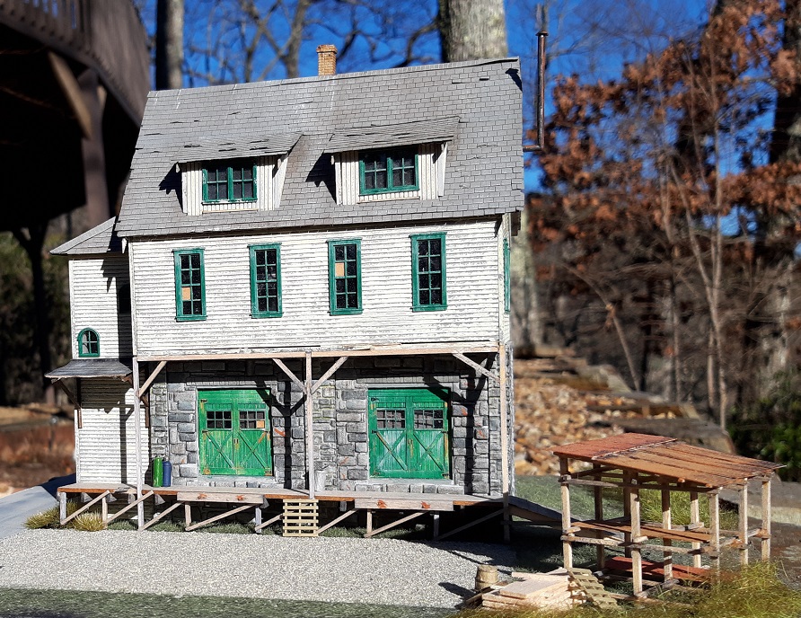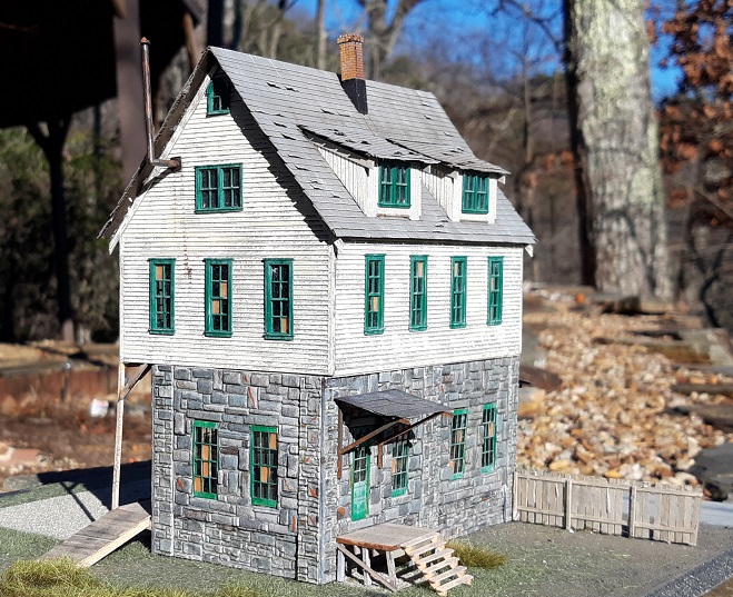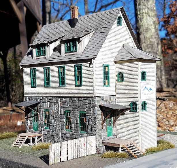 The South Mountain 'Still & Supply structure depicts a stone masonry first level, and clapboard structure for the upper levels and staircase structure along the side. The name of the structure depicts that it's a distilling supply house, but of course can be modified to fit the needs of any modeler's layout and railroad.